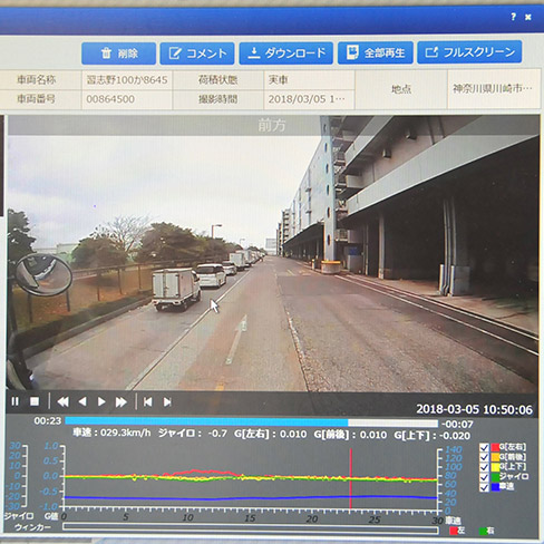 ドライブレコーダはトラックが衝撃を受けると、フロントガラスに取り付けられたカメラの映像が記録されるものです。事故だけでなく急減速・急制動も記録されるので安全教育にも活用しております。